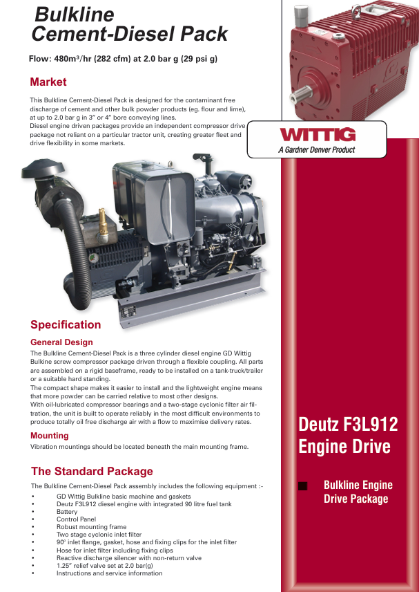 Overview: Gardner Denver’s Bulkline series offers oil-free screw compressors designed specifically for the contaminant-free discharge of dense bulk powder products, such as cement, flour, and lime. These compressors are ideal for applications requiring clean, reliable, and efficient pneumatic conveying.
