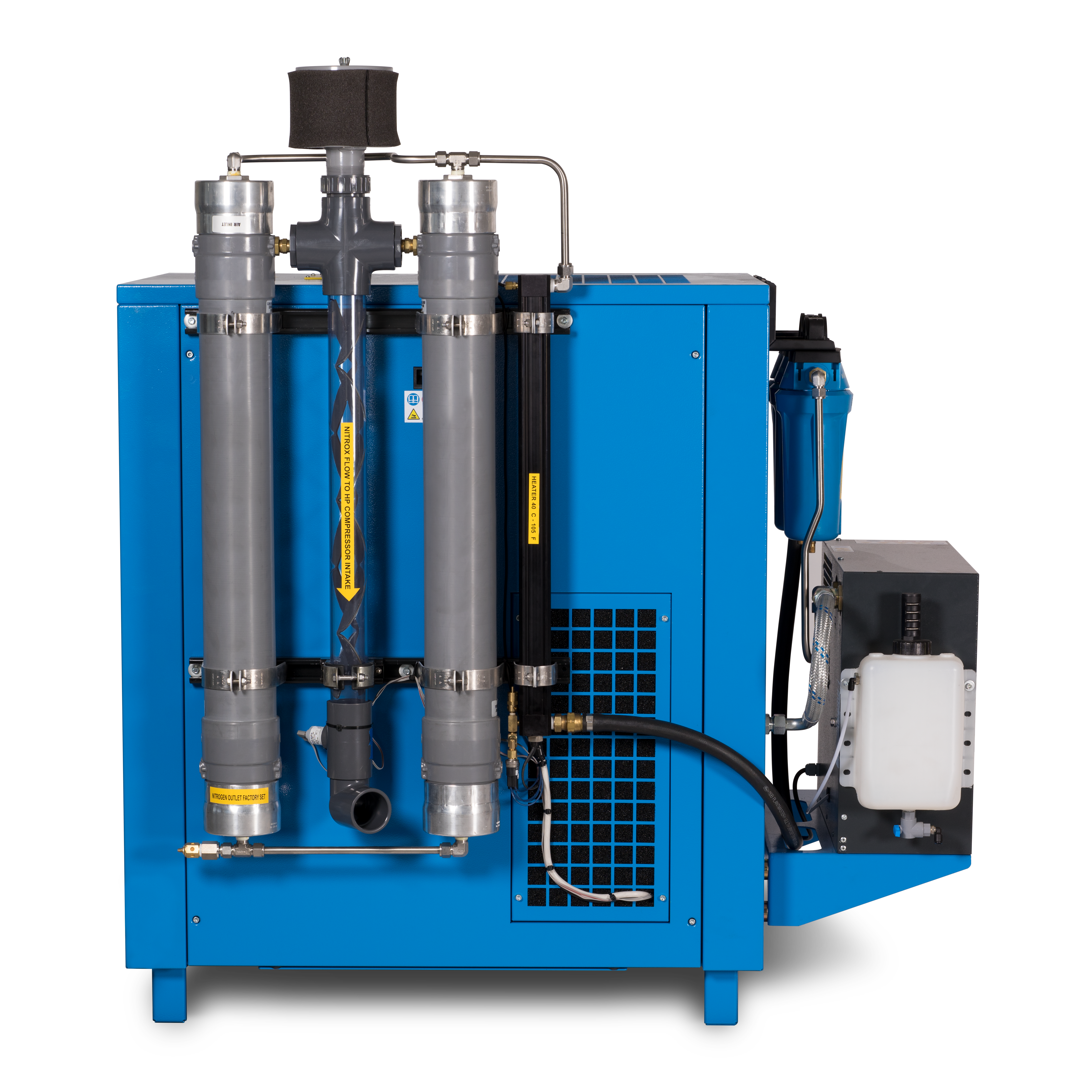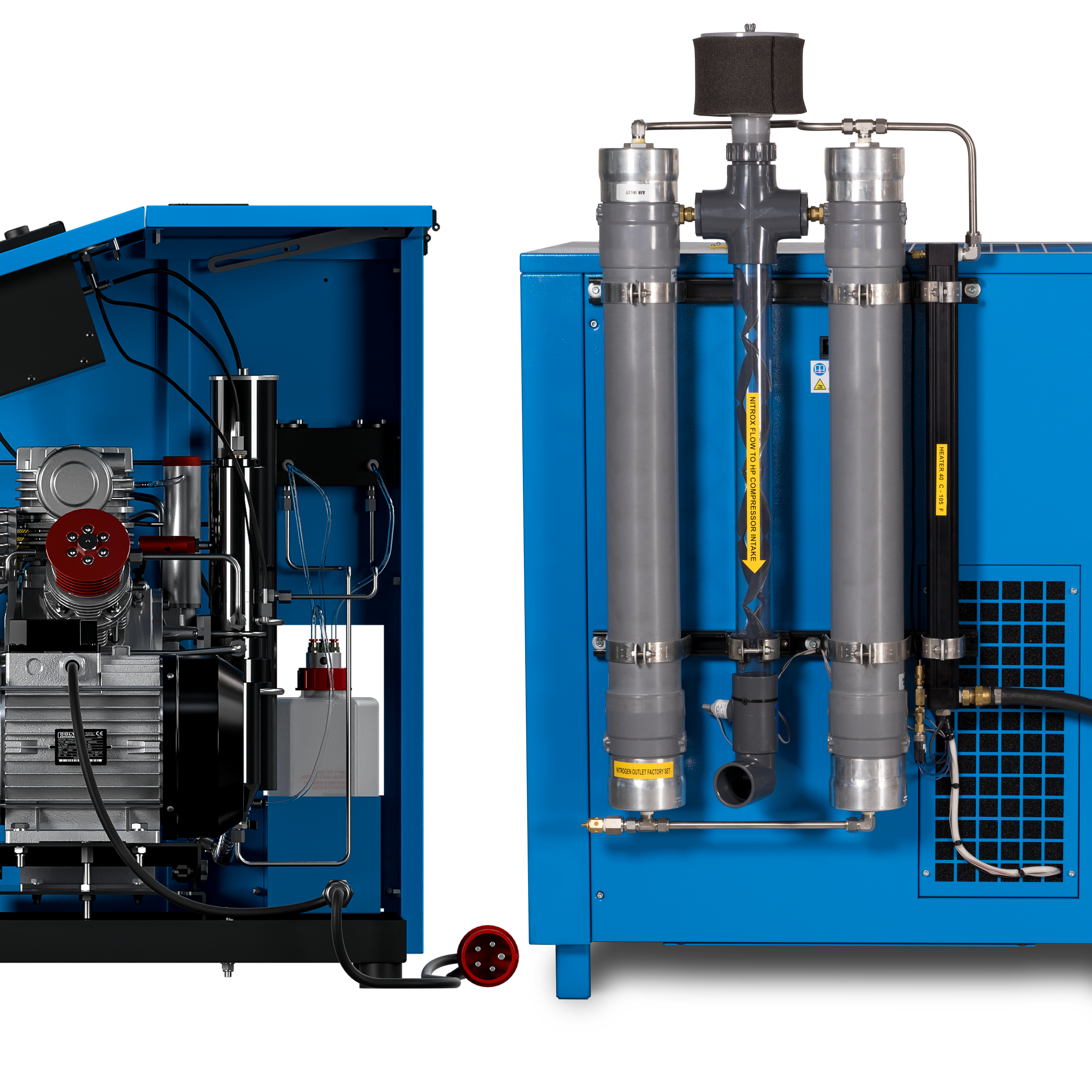 This setup features an industrial screw compressor that provides air at 12 bar pressure to a membrane, which separates nitrogen and oxygen, achieving up to 40% oxygen. The oxygen-enriched air can then be compressed to 232 bar when paired with a high-pressure compressor. The oxygen concentration at the output can be adjusted between 22.4% and 40% using a valve located on top of the compressor. An oxygen analyzer is included to ensure the correct oxygen level and to make any necessary adjustments using the designated valve.